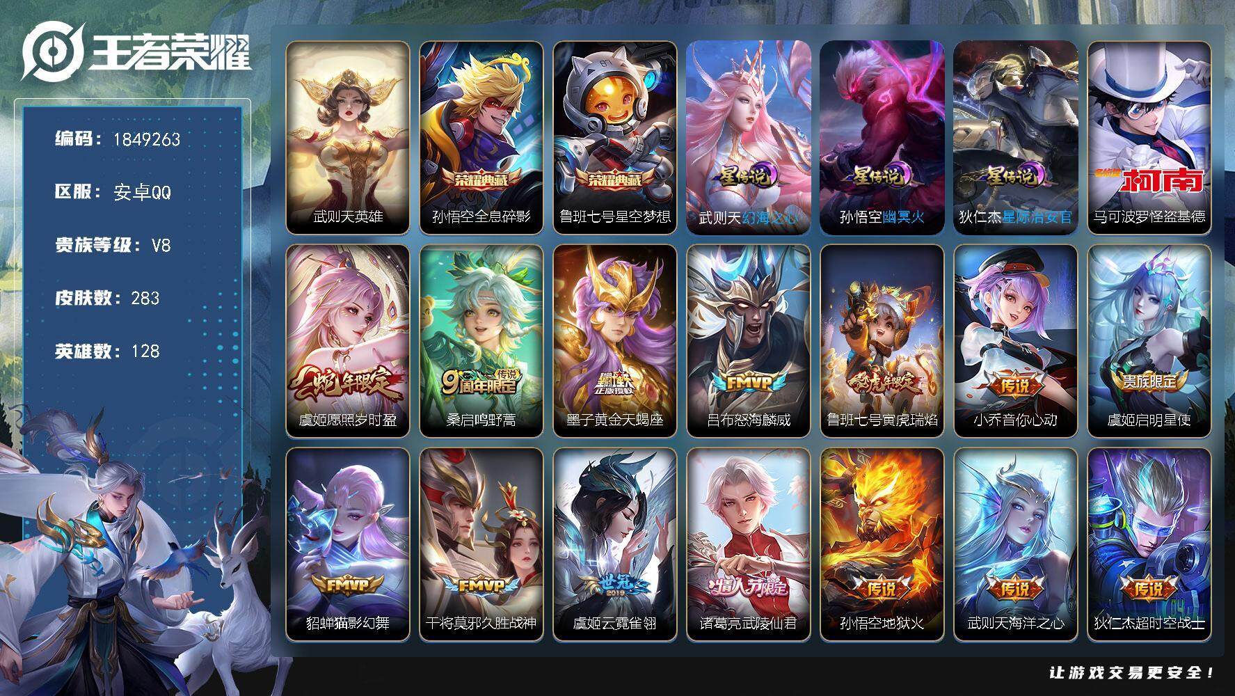 V8 1典藏 1无双 22传说 69史诗 251皮肤 至圣王者...¥4018.00