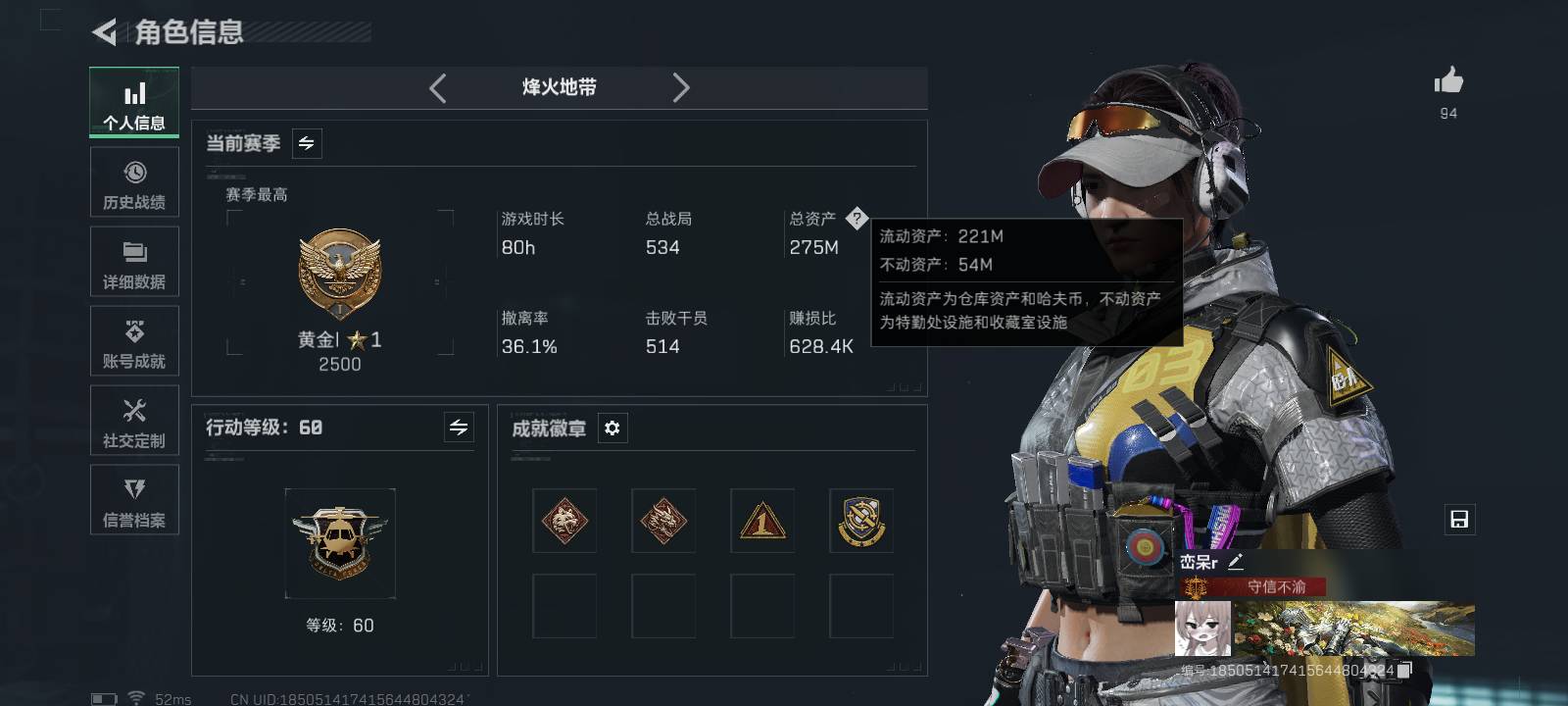 总资产8M 4干员外观 5传说枪械 无段位 蛊-能天使·午夜邮差露娜-黑·天际线蜂医-无题密令无名