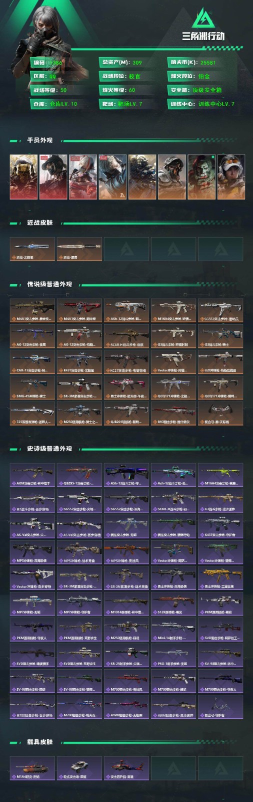 总资产9M 2干员外观 1近战 21传说枪械 烽火:三角洲巅峰 战场:...¥1000.00