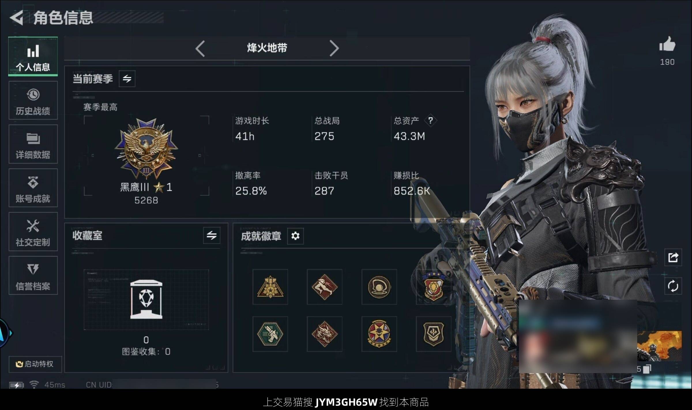 总资产192.4M 6干员外观 1近战 27传说枪械 烽火:钻石 战场...¥3000.00